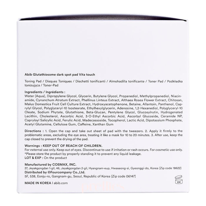 Package Content: 1x Abib Glutathiosome Dark Spot Pad Vita Touch 60pcs